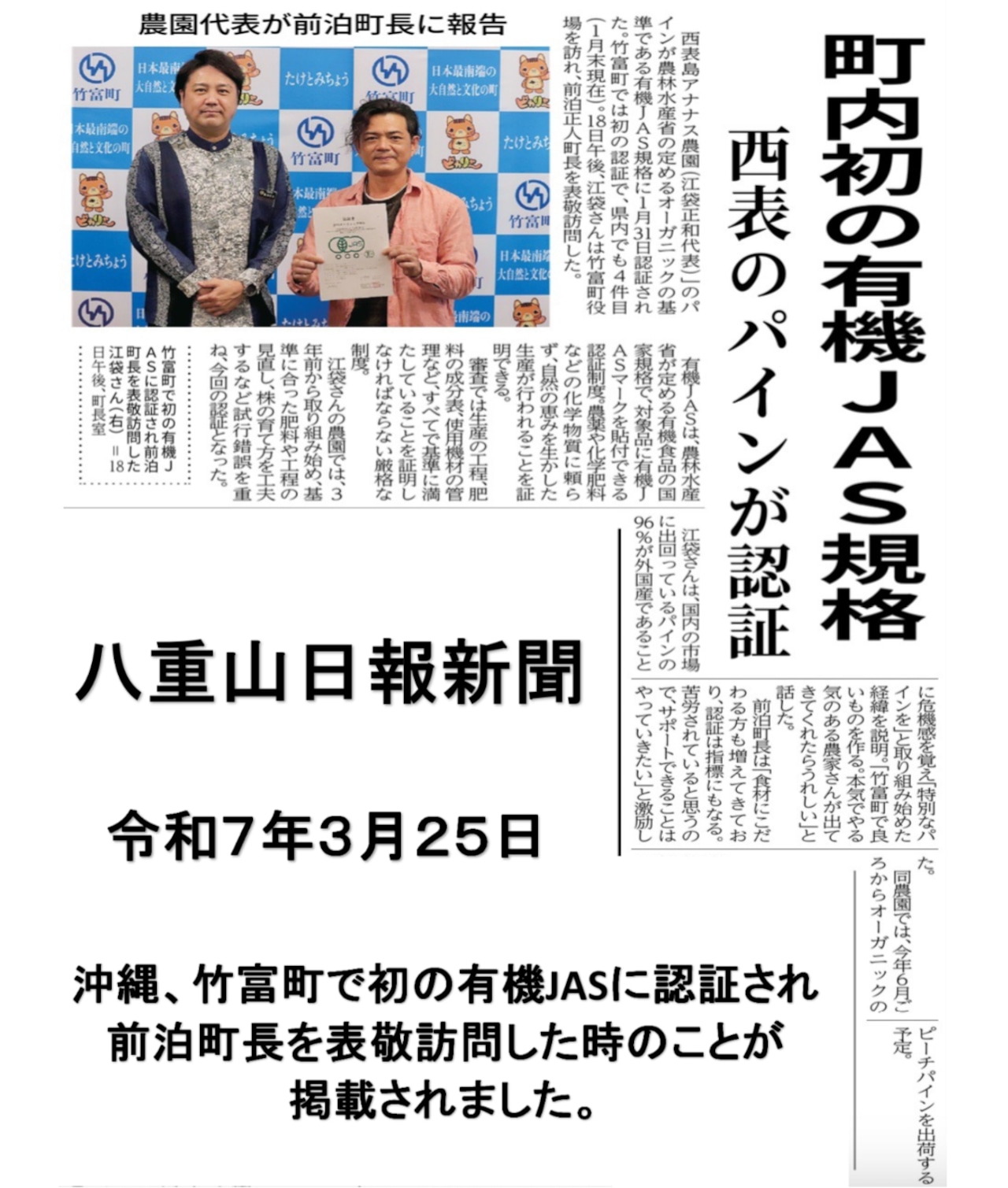 西表島を含む竹富町では全作物を通じて初。